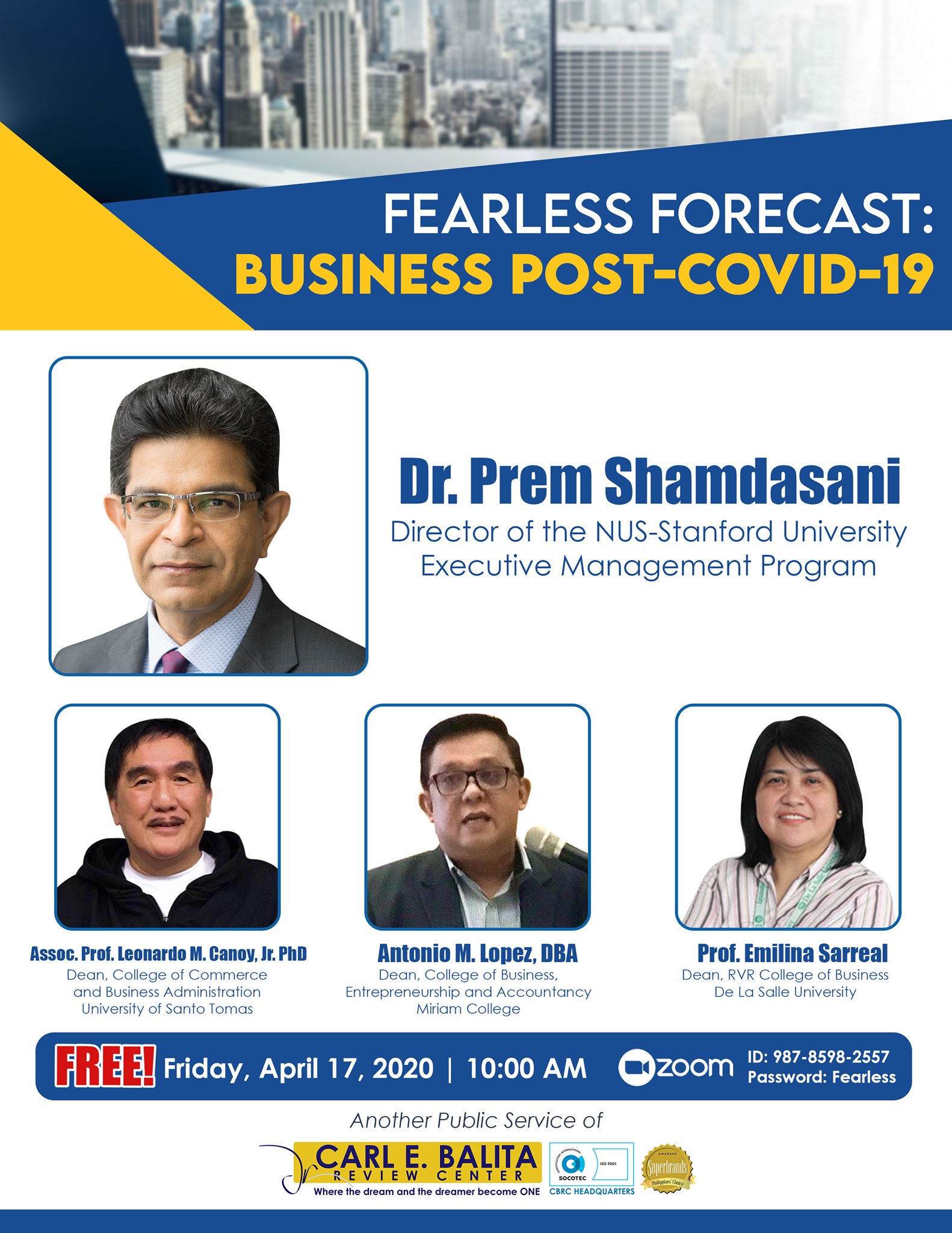The Philippine Academy of Management (PAOM) invites PAOM members to join us in a free webinar via Zoom titled “Fearless Forecast: Business Post-COVID-19” this April 17, 2020, Friday, 10:00 AM. The Zoom ID is 987-8598-2557 with the password: Fearless. The webinar will be facilitated by the NUS-Stanford University Executive Management Program Director Dr. Prem Shamdasani, University of Santo Tomas College of Commerce and Business Administration Dean Dr. Leonardo M. Canoy, Jr., Miriam College – College of Business, Entrepreneurship, and Accountancy Dean Dr. Antonio M. Lopez, and De La Salle University RVR-COB Dean Dr. Emilina Sarreal.