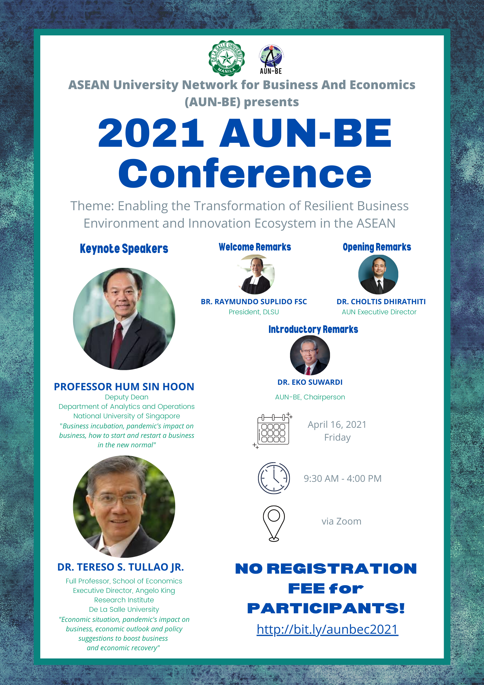 The 2021 AUN-BE Conference aims to harness the experiences, outlook, and strategies that would enable business and economic societies in the ASEAN region to become catalysts for alleviating the catastrophic effects of the pandemic on businesses and the economy.