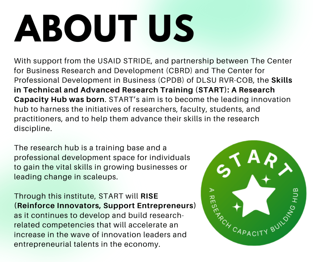 The Philippine Academy of Management extends the invitation to join START – A Research Capacity Building Hub, which aims to harness the initiatives of researchers, faculty, students, and practitioners, and to help them advance their skills in the research discipline.