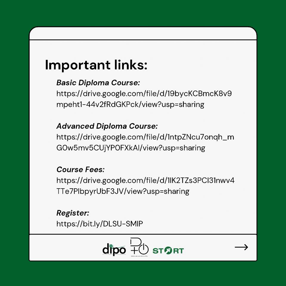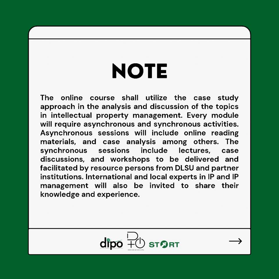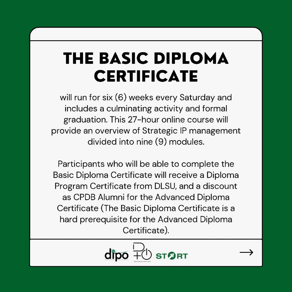 The DLSU Intellectual Property Office (DIPO) and the DLSU Innovation and Technology Office (DITO) in partnership with the DLSU Skills in Technical and Advanced Research Training (START) Center with support from USAID-STRIDE cordially invites members of PAoM to an ‘Online Diploma Course on Strategic Management of Intellectual Property’