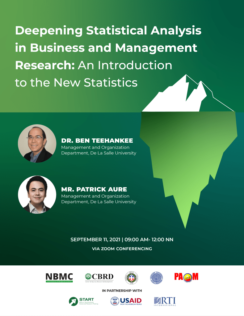 The Philippine Academy of Management (PAoM) invites you all to the first capacity-building webinar leading to the 9th National Business and Management Conference (NBMC) on November 19 and 20, 2021. Join us on September 11, 2021, from 9:00 AM to 12:00 PM as Dr. Benito Teehankee and Mr. Patrick Adriel Aure discuss with us “Deepening Statistical Analysis in Business and Management Research: An Introduction to the New Statistics.”
