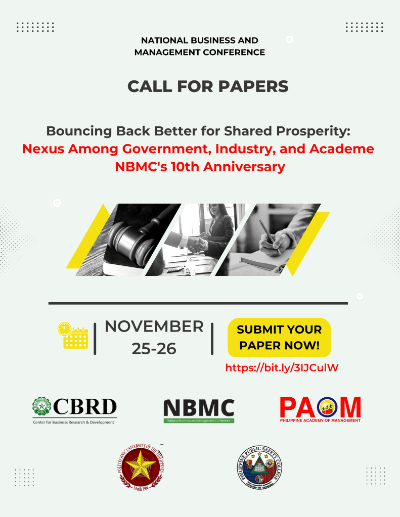 The theme of the conference is “Bouncing Back Better for Shared Prosperity: Nexus Among Government, Industry, and Academe – NBMC’s 10th Anniversary.” With this, the National Business and Management Conference renews our commitment in pursuing the Sustainable Development Goals and fulfilling the Covenant for Shared Prosperity. The conference welcomes the submission of papers/abstracts in various areas of business and management including: accountancy, agribusinesses, business continuity planning, business ethics, business innovation, commercial law, corporate governance, corporate social responsibility, corporate sustainability, entrepreneurship, family business management, financial management, hospitality management, human resource management, humanistic management, information technology, international business, management education, marketing management, responsible management education, sports management, strategic management, sustainable development, and sustainable tourism.